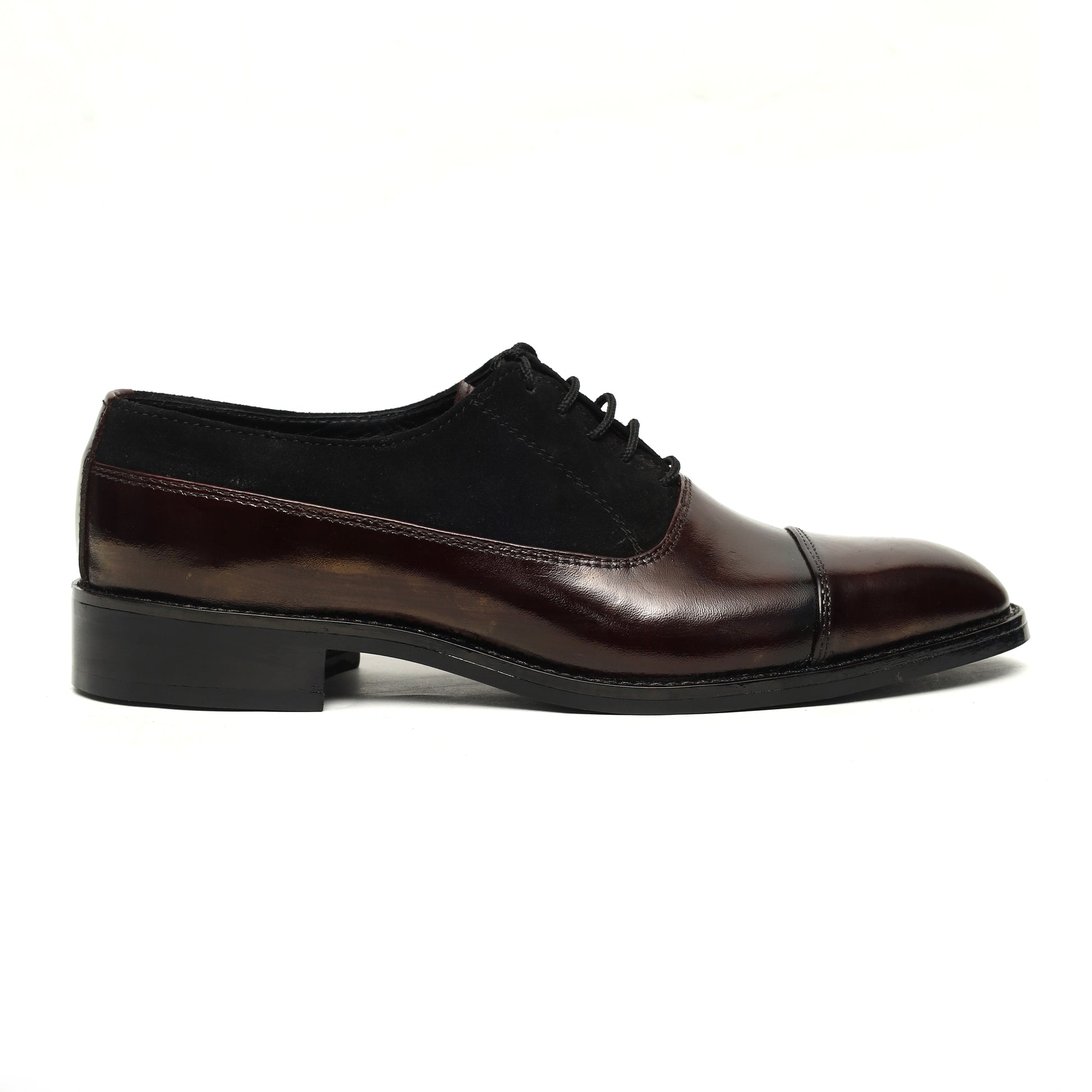 A beautiful pair of two-tone oxford-style formal shoes with a rich burgundy leather and black suede combo